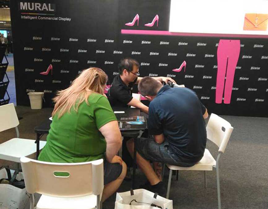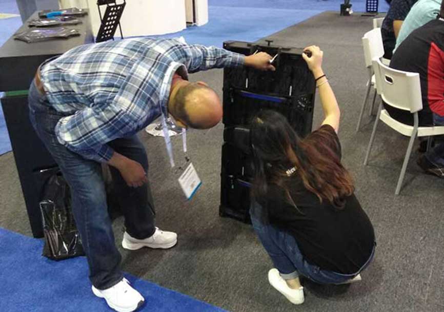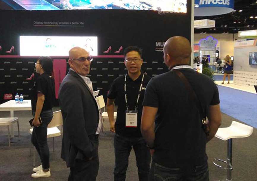 德彩X-Plus產(chǎn)品,以行業(yè)首創(chuàng)的智能連屏、傻瓜式操作以及行業(yè)獨特設計的弧度鎖的產(chǎn)品特點,收獲了大量好評,成為InfoComm展的最大亮點之一。X-Plus以弧形展示方式,充分的展示了展品特點,吸引了很多客戶駐足,同時也吸引了同行的觀摩。更有客戶連續(xù)兩天蒞臨德彩展位洽談代理事宜。